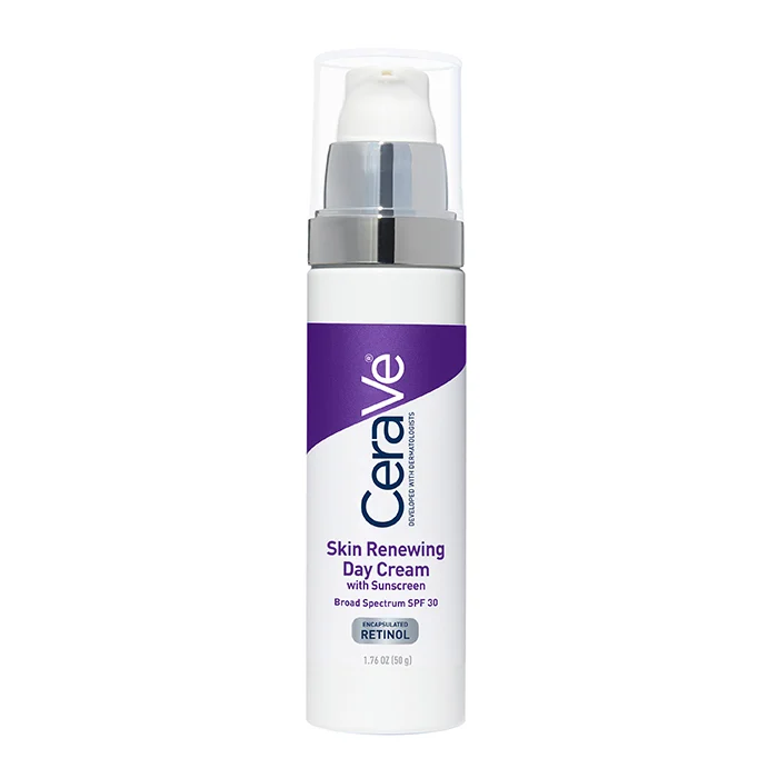 Skin Renewing Day Cream with broad spectrum SPF 30 includes retinol to improve the look of lines, wrinkles, skin texture, and radiance. Non-comedogenic.